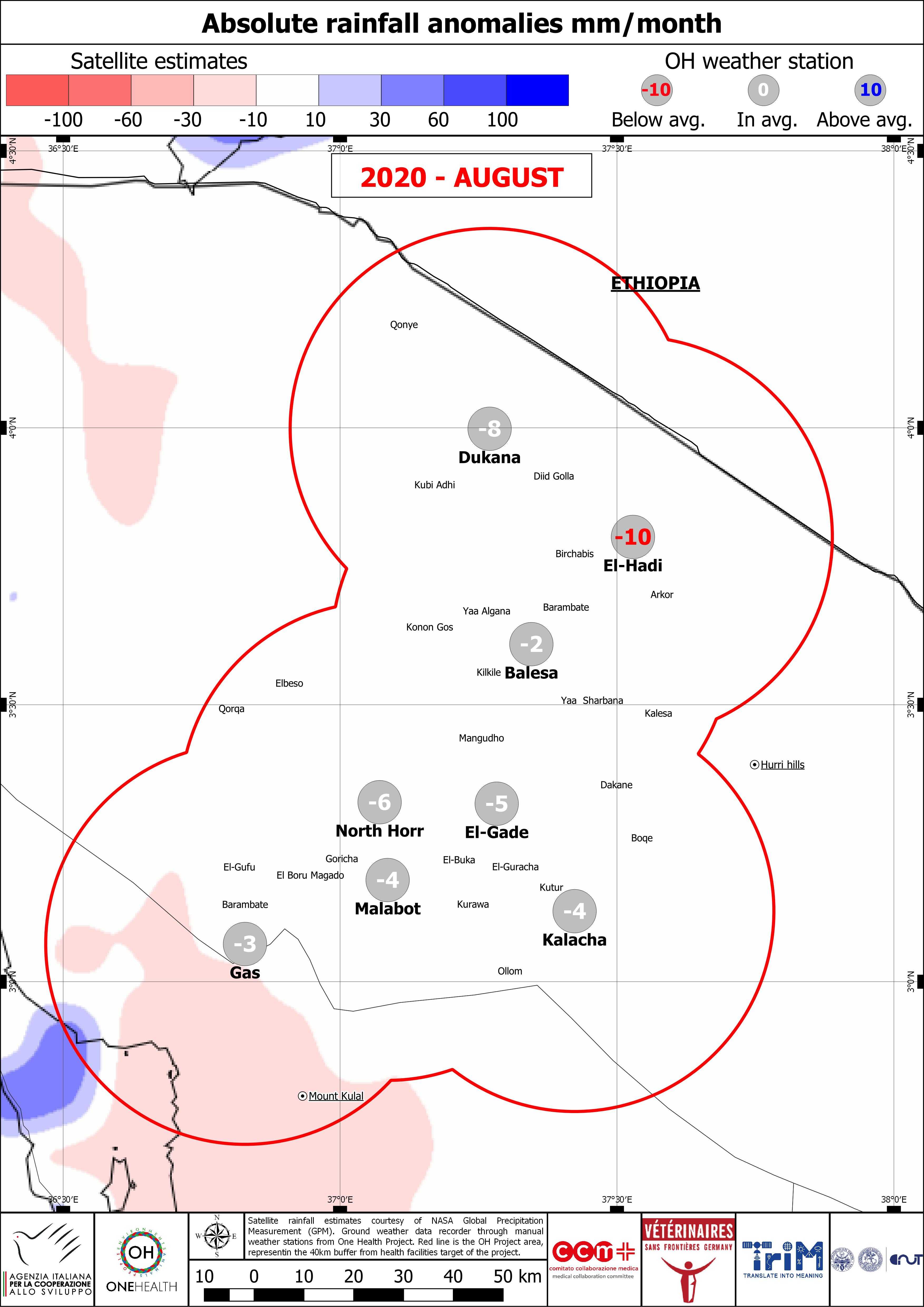 Rainfall anomalies are the following: El-Hadi (-10mm), Dukana (-8mm), North Horr (-6mm), El-Gade (-5mm), Kalacha (-4mm), Malabot (-4mm), Gas (-3mm) and Balesa (-2mm).